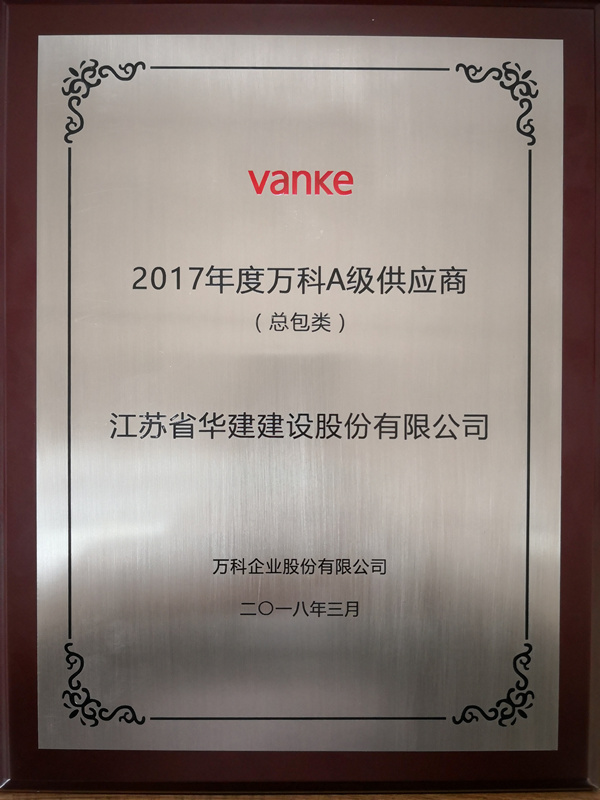 公司被萬科集團評為總包類2017年度萬科A級供應商 時間:2018-03-24 3629 3月16日下午,江蘇華建董事長王宏、北京分公司總經理呂進和北京分公司四處主任朱建奇應邀參加萬科集團舉辦的合作伙伴春茗會。會上,江蘇華建被萬科集團評為總包類2017年度萬科A級供應商,呂總代表江蘇華建上臺領取了榮譽獎牌。