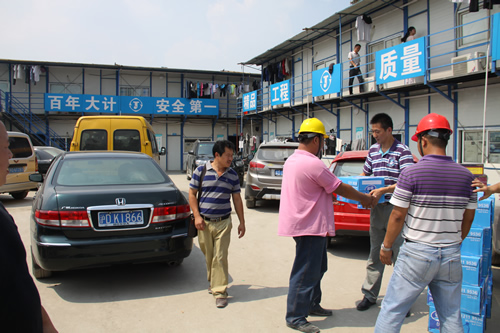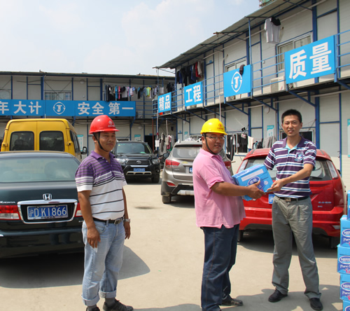 為一線員工送清涼 時間:2013-07-29 5188 驕陽似火,熱浪滾滾,持續近一個月的高溫天氣給工程正常施工帶來了很大的影響,奮戰在烈日炎炎下的一線員工的身體狀況時刻牽動著公司領導的心。7月29日,上海室外溫度更是超過40度,江蘇華建副總經理、上海分公司總經理楊杰特地委托總工程師魏春明、工會副主席陳德權等同志赴由公司承建的上海楓葉國際學校工地看望一線作業人員,為員工送去了礦泉水、毛巾等清涼慰問品,并叮囑要注意避開高溫作業時段,保護身體,確保夏季施工生產安全。