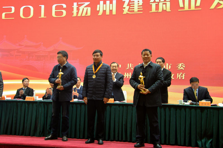 會議由聞道才副市長主持,與會人員首先觀看了“十二五”揚州建筑業(yè)發(fā)展專題片,聽取了朱民陽市長所做的工作報告。然后市政府對2015年全市建筑業(yè)目標(biāo)管理獎獲獎單位和全市建筑業(yè)先進企業(yè)、先進個人進行了表彰。建工控股公司獲得唯一的2015年市政府建筑業(yè)目標(biāo)管理一等獎,位列各縣(市)區(qū)之上,市委書記謝正義親自向陸金龍董事長頒獎。2015年全市僅有的兩項魯班獎工程均由江蘇華建創(chuàng)造,宗有農(nóng)總經(jīng)理、吳士茂主席上臺領(lǐng)獎。此外,江蘇華建還有4名員工分別被市政府表彰為優(yōu)秀建造師、優(yōu)秀班組長。
