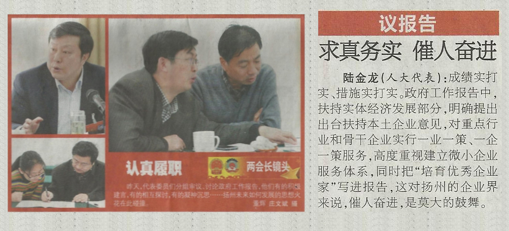 元月7日的《揚州日報》焦點新聞欄目報道了我公司董事長陸金龍參加揚州市七屆人大二次會議的有關情況。本次人代會6日上午在揚州會議中心隆重開幕,作為市人大代表,陸董事長在會上認真參與對朱民陽市長代表政府所作工作報告的討論,并圍繞“六個基本”抓發展、合力推進“三個揚州”和世界名城建設、加快建設更高水平小康社會積極建言獻策。《揚州日報》在人大代表“議報告”中第一個刊登了陸董事長的發言:“成績實打實、措施實打實。政府工作報告中,扶持實體經濟發展部分,明確提出出臺扶持本土企業意見,對重點行業和骨干企業實行一業一策、一企一策服務,高度重視建立微小企業服務體系,同時把‘培育優秀企業家’寫進報告,這對揚州的企業界來說,催人奮進,是莫大的鼓舞?!?/SPAN>
