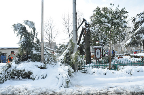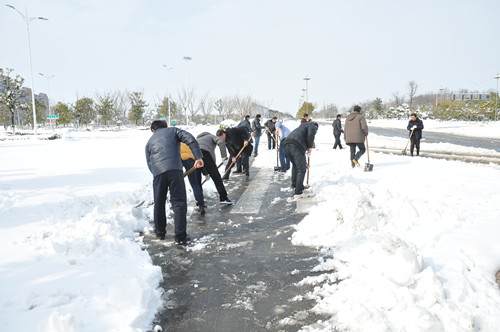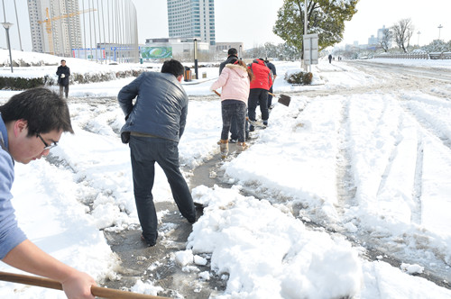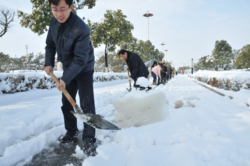 公司總部組織員工上路清掃積雪 時間:2013-02-19 4508 2月18日至19日凌晨,揚州出現低溫降雪災害天氣,降下了多年罕見的一場大雪,壓垮樹枝和部分房屋設施,并造成道路交通不便。19日清晨,公司響應市政府號召,組織20余名員工上路清掃積雪,公司領導吳士茂、錢啟明親自參加,與大家共同會戰2個多小時,完成了清掃任務。 厚重的積雪壓垮樹枝