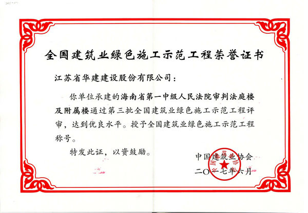 6月28-29日,中國建筑業協會綠色建造與施工分會在山東省濟南市舉辦全國建筑業綠色施工創新發展經驗交流會,對經竣工評審合格的工程頒發全國建筑業綠色施工示范工程證書。由海南公司承建的“海南省第一中級人民法院審判法庭樓及附屬樓”項目首次榮獲第三批“全國建筑業綠色施工示范工程”稱號。