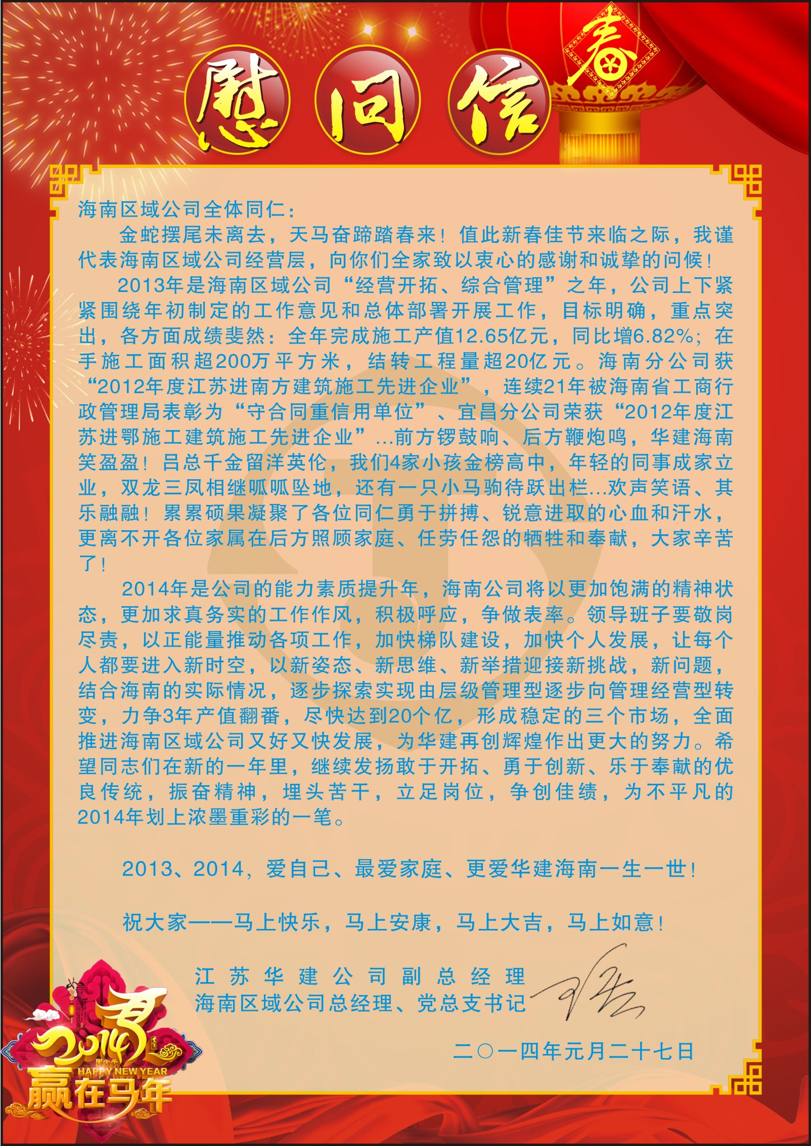 公司副總、海南區域公司總經理王宏致全體員工新春慰問信