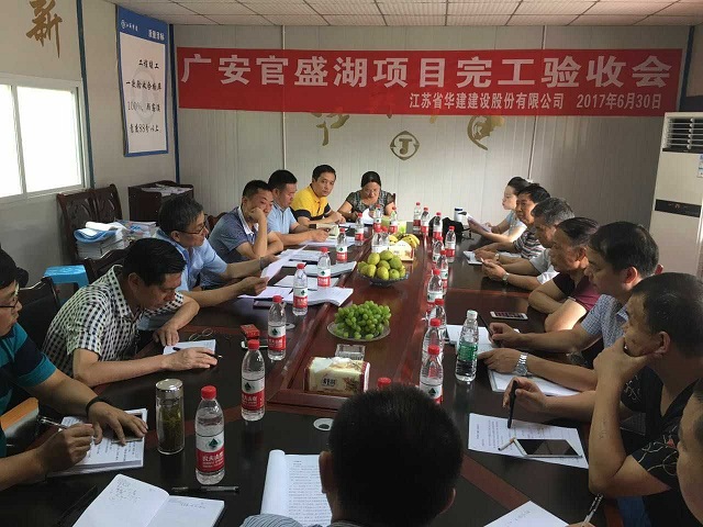 華建第一壩——官盛湖大壩工程順利通過完工驗收 時間:2017-07-03 4125 6月30日上午,華建首個水利項目——官盛湖大壩工程完工驗收會在項目會議室召開,廣安官盛新區管委會副主任蔣成文主持會議。經項目勘察、設計、監理、區住建局、質監站、水務局、發改局、財政局等單位和業主現場代表實測檢查、分別總結匯報后,一致同意工程驗收合格。 官盛湖大壩作為一項以城市景觀為主、兼有防洪功能的綜合性水利工程,主要由樞紐工程、泄洪渠工程組成。官盛湖湖區總庫容987.73萬立方米,壩頂長349米,最大壩高48.5米,壩體填筑總量達157.93萬方。