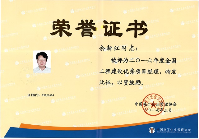 余新江榮獲“2016年度全國工程建設優秀項目經理” 時間:2017-04-24 3669 4月20日 ,中國施工企業管理協會第32次年會在廈門召開。會上,中施企協對全國優秀項目經理進行了表彰,珠海分公司余新江同志被授予“2016年度全國工程建設優秀項目經理”稱號。