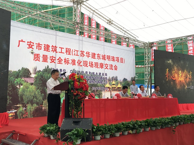 岳池縣副縣長楊偉首先致辭,對觀摩會的順利召開表示祝賀。公司常務副總經理程杰作為施工單位代表,簡要介紹了東城明珠項目概況,并從工程質量安全管理、綠色環保理念、標準化建設等方面對項目管理經驗作了交流分享。廣安市住建局總工程師劉運舉作總結發言,他對江蘇華建積極投資廣安城市建設表示感謝,指出江蘇華建連續三年承辦廣安市建筑工程質量安全標準化施工現場觀摩會,為廣安建筑企業樹立了學習的榜樣和標桿,并從擴大質安監管覆蓋面,構建“網格化”監管體系,實現檢查方式、檢查內容、差別化管理、工作重心“四個轉變”等方面對全市建筑工程質量安全工作提出具體要求。