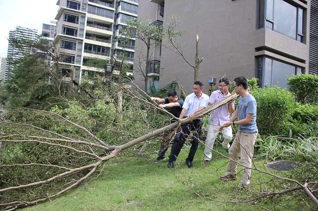 中午11時(shí)開始,臺(tái)風(fēng)臨近,狂風(fēng)暴雨橫掃珠海,中午13時(shí)許,臺(tái)風(fēng)中心正面登陸珠海,出現(xiàn)了短暫的平靜。公司隨即指示各項(xiàng)目部不得松懈,所有人員不得離開安全區(qū)域。緊接著,臺(tái)風(fēng)再次肆掠。14時(shí)許,金灣區(qū)停水、停電、通訊中斷。23日下午,在經(jīng)歷過臺(tái)風(fēng)的侵襲后,珠海道路樹木大片倒伏,交通基本癱瘓。公司利用偶有通訊信號(hào)的機(jī)會(huì)聯(lián)系各項(xiàng)目部確認(rèn)受災(zāi)情況。因部署及時(shí),本次臺(tái)風(fēng)并未造成人員傷亡。