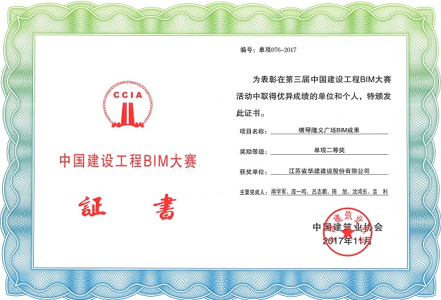 12月20日,由中國(guó)建筑業(yè)協(xié)會(huì)主辦的第三屆中國(guó)建設(shè)工程BIM大賽結(jié)果正式公布,江蘇華建珠海公司申報(bào)的《橫琴隆義廣場(chǎng)BIM成果》獲得單項(xiàng)組二等獎(jiǎng)。