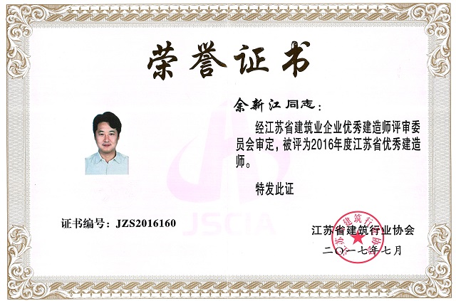 公司1位同志被授予“江蘇省優秀建造師”榮譽稱號 時間:2017-12-12 4361 日前,江蘇省建筑行業協會下發了《關于2016年度江蘇省建筑業優秀建造師的決定》,公司余新江同志位列榜單,榮獲表彰,被授予“江蘇省優秀建造師”榮譽稱號。