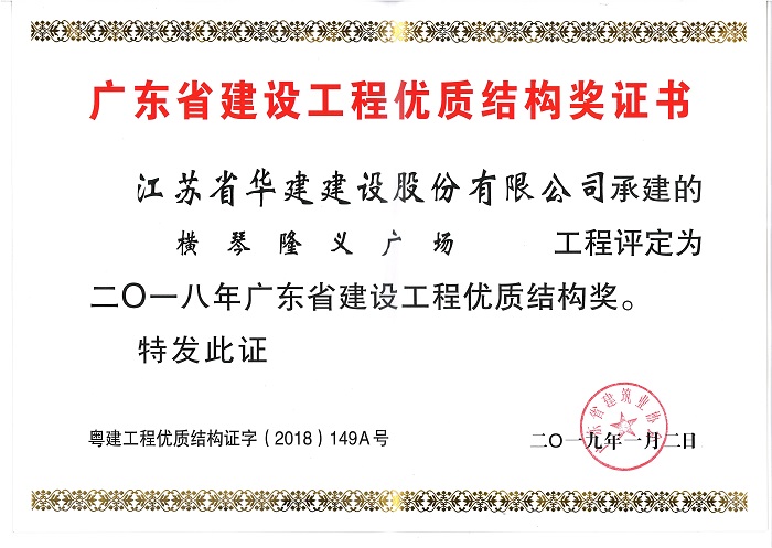 公司3個項目喜獲多項省級表彰 時間:2019-04-10 3883 近日,廣東省建筑業協會、廣東省建筑安全協會分別發文表彰了一批優質結構工程、綠色施工示范工程和安全文明工地,公司3個項目榮列榜單。其中,陽光馬德里、橫琴隆義廣場、華策國際大廈均被表彰為二〇一八年廣東省建設工程優質結構獎,華策國際大廈被授予廣東省建筑業綠色施工示范工程稱號,橫琴隆義廣場被評為2017年廣東省房屋市政工程安全生產文明施工示范工地。