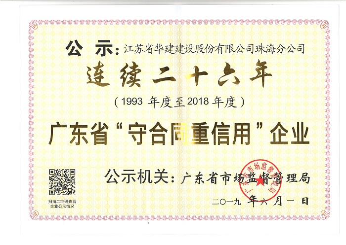 公司連續二十六年被廣東省市場監督管理局表彰為“守合同重信用企業” 時間:2019-07-01 3694 近日,珠海分公司被廣東省市場監督管理局(原公示機關為廣東省工商行政管理局)授予“連續二十六年守合同重信用企業”榮譽稱號。