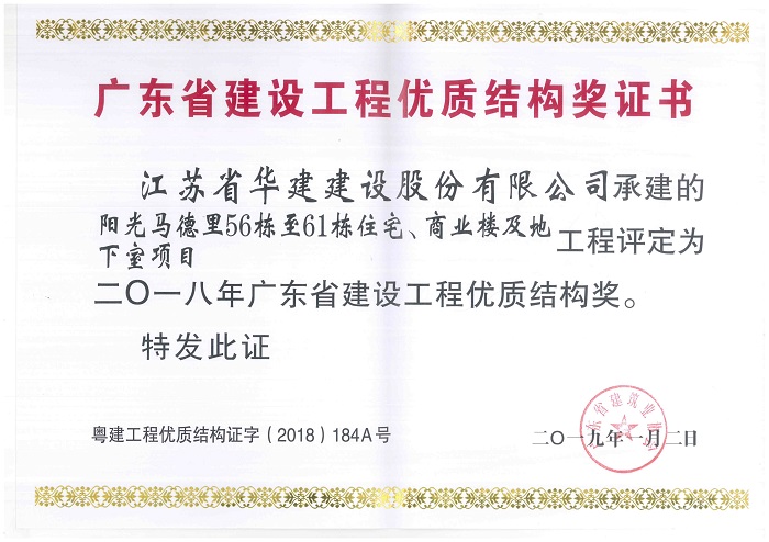 陽光馬德里獲2018年廣東省建設工程優質結構獎