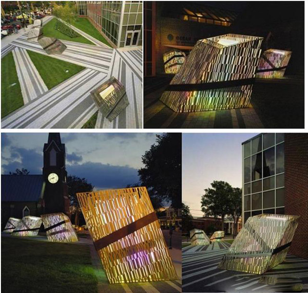 美國Mikyoung Kim完成了新澤西州海洋縣公共圖書館門前的一系列景觀照明設(shè)計(jì)。這個(gè)由激光切割不銹鋼和玻璃構(gòu)成的景觀燈具,應(yīng)用了條碼圖案來表達(dá)在數(shù)字時(shí)代下信息的傳播。五個(gè)一組的燈具被用激光切割成的鋼鐵包裹在一起,它們既能反射光線,又能從內(nèi)部發(fā)出光芒,從白天到黑夜都有變化。