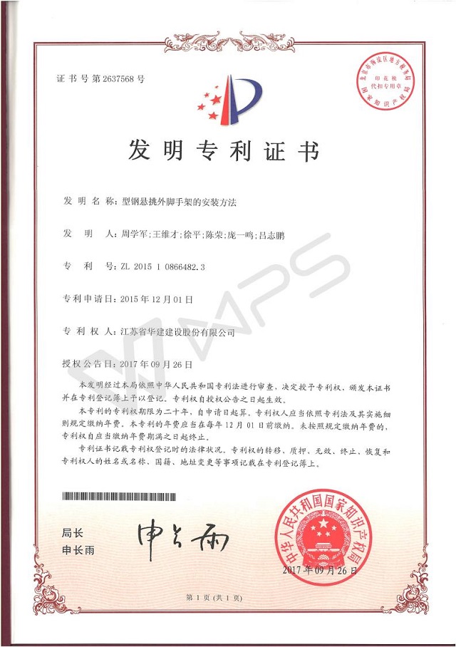 近日,江蘇華建珠海區(qū)域公司《型鋼懸挑外腳手架的安裝方法》獲得國(guó)家發(fā)明專(zhuān)利授權(quán),這是珠海區(qū)域...