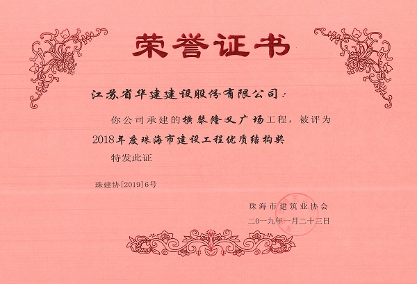 橫琴隆義廣場獲2018年度珠海市建設工程優質結構獎