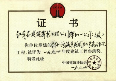 本工程在施工中能精心組織,通過QC小組活動(dòng),嚴(yán)格把關(guān)工程9個(gè)分部全部?jī)?yōu)良。在1993年的深圳市優(yōu)質(zhì)樣板評(píng)選中名列第一,同時(shí)榮獲1994年江蘇省金牌獎(jiǎng)和1994年建設(shè)部部?jī)?yōu)獎(jiǎng),1994年建筑工程魯班獎(jiǎng)。