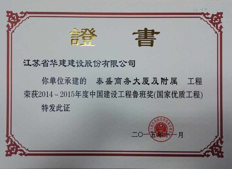 泰盛商務(wù)大廈及附屬工程地處秦皇島市經(jīng)濟開發(fā)區(qū)核心位置,集商務(wù)辦公、會議中心、一站式服務(wù)大廳及報告演藝廳等功能為一體的綜合類商務(wù)辦公樓,地下1層,地上23層,裙樓兩層,建筑面積90148㎡,建筑高度97.75米。工程先后榮獲全國建筑業(yè)綠色施工示范工程、江蘇省新技術(shù)應(yīng)用示范工程、江蘇省省級工法、河北省結(jié)構(gòu)優(yōu)質(zhì)工程獎、河北省建設(shè)工程安濟杯獎(省優(yōu))、全國優(yōu)秀項目管理成果獎、全國優(yōu)秀QC小組成果一等獎。2015年,被中建協(xié)評為2014-2015年度中國建設(shè)工程魯班獎(國家優(yōu)質(zhì)工程)。