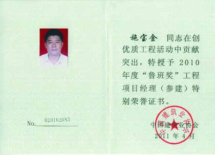 施寶金,高級(jí)工程師,現(xiàn)任深圳公司七處二工區(qū)常務(wù)副主任、項(xiàng)目經(jīng)理。1996年到深圳參加工作,參與過國際商會(huì)中心、榮超經(jīng)貿(mào)中心、江勝大廈、綠景紀(jì)元大廈等重點(diǎn)項(xiàng)目施工,獲“深圳市建筑業(yè)企業(yè)優(yōu)秀項(xiàng)目經(jīng)理”稱號(hào),被授予“創(chuàng)魯班獎(jiǎng)工程項(xiàng)目經(jīng)理特別榮譽(yù)證書”。