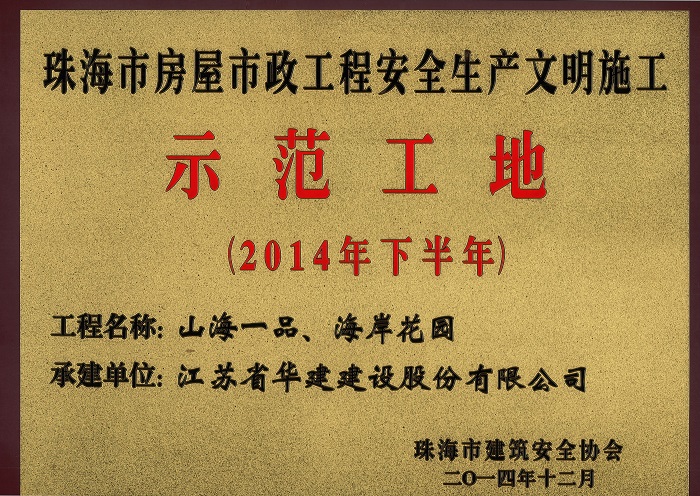 山海一品海岸花園榮獲2014年下半年珠海市房屋市政工程安全生產(chǎn)文明施工示范工地